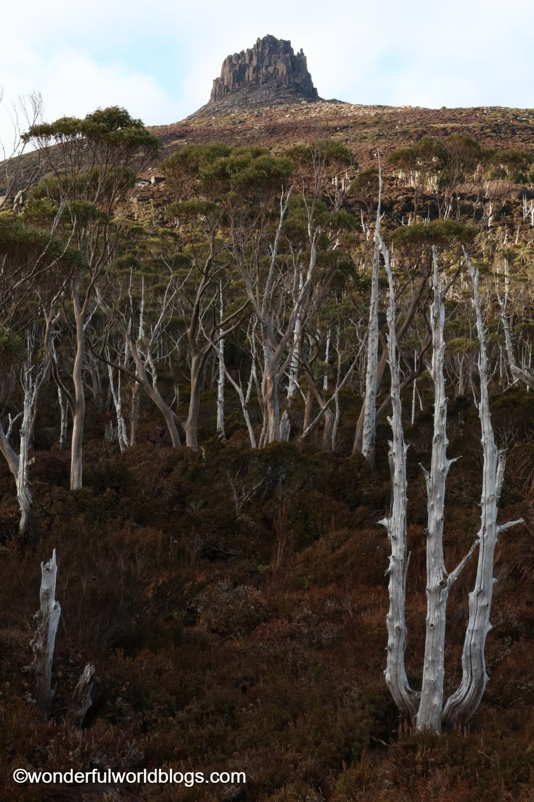The way continued across windswept moorland and ascended through tangled forest to a high plateau at Pinestone Valley with a gallery of peaks including Mount Pelion East, looking like an evil sorcerer's castle, and the jagged outlines of Tassie's highest mountain, Mount Ossa (1,617 metres), glowing in the early evening sun.