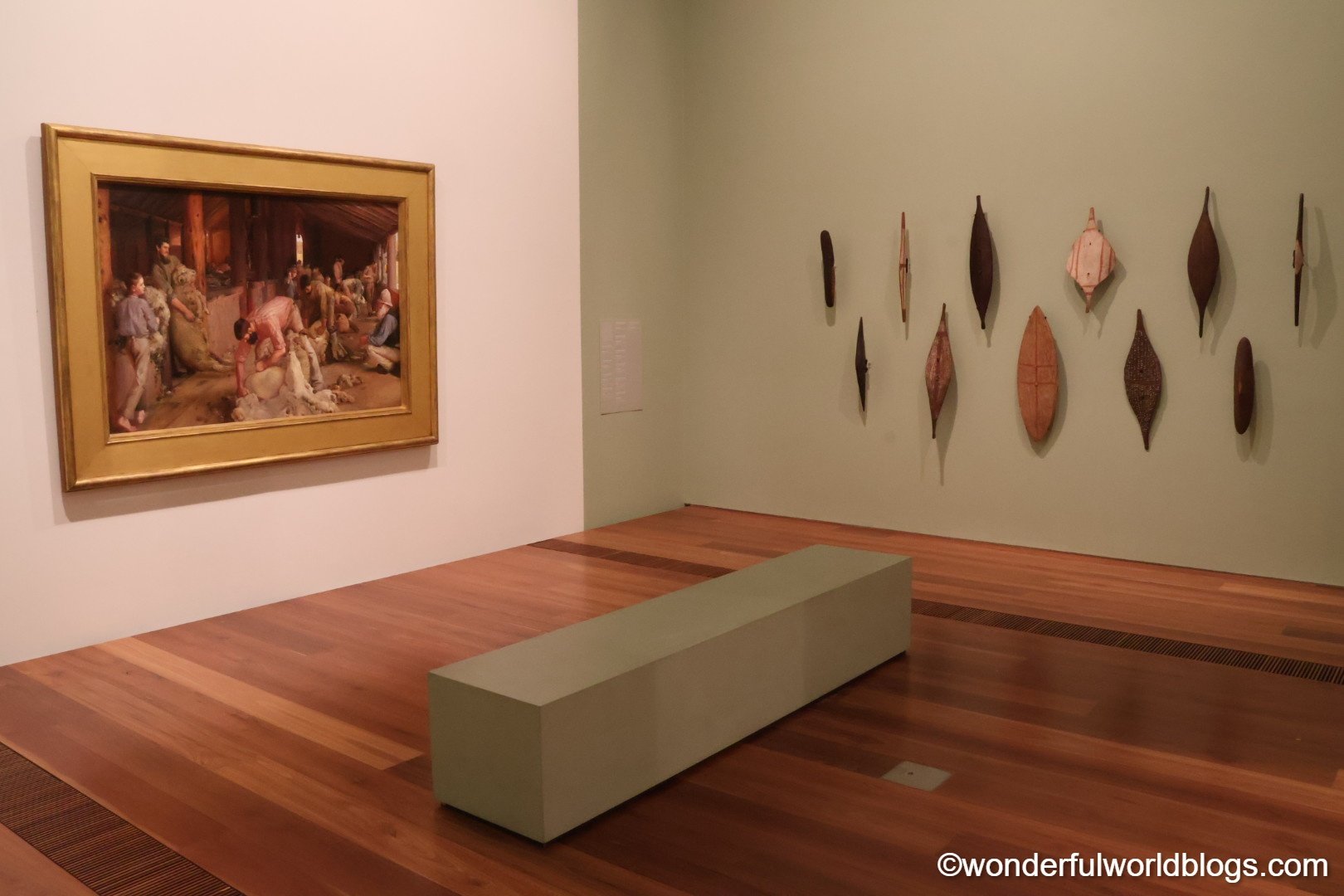 In a small room in the National Gallery of Victoria in Melbourne are exhibits showing two very different sides of Australia. On one wall is a proud, naturalistic, painting of men Shearing the Rams by Tom Roberts dating from 1890, a scene that could easily be from Wales if it weren't for the bright sunshine and the sunhats worn by some. On another is a collection of Aboriginal shields, some as thin as sticks, some leaf shaped, simply decorated, with plain colours and abstract designs. Two very different worlds in one room, in one country.