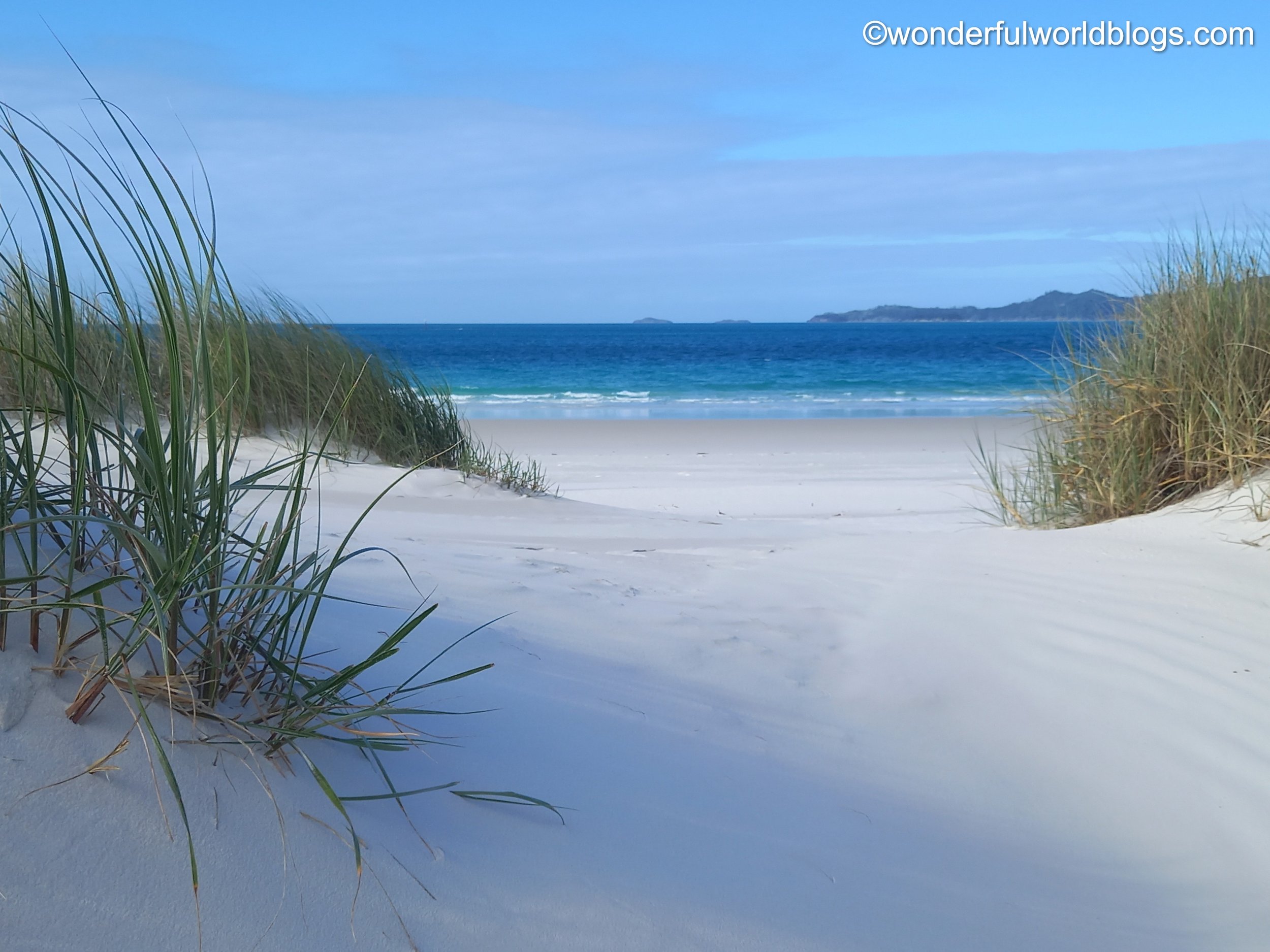 Towards the south of the reef lie the Whitsunday Islands, traditionally home to the Ngaro people, but named after the day of Captain Cook's arrival in 1770. Of these the jewel in the crown is Whitehaven Beach on Whitsunday Island where I camped for four days - seven kilometers of white powdery sand and sparkling sea backed by low hills covered in thick bush. There are no buildings, water or electricity and no rubbish. It is rated one of the ten best beaches in the world.