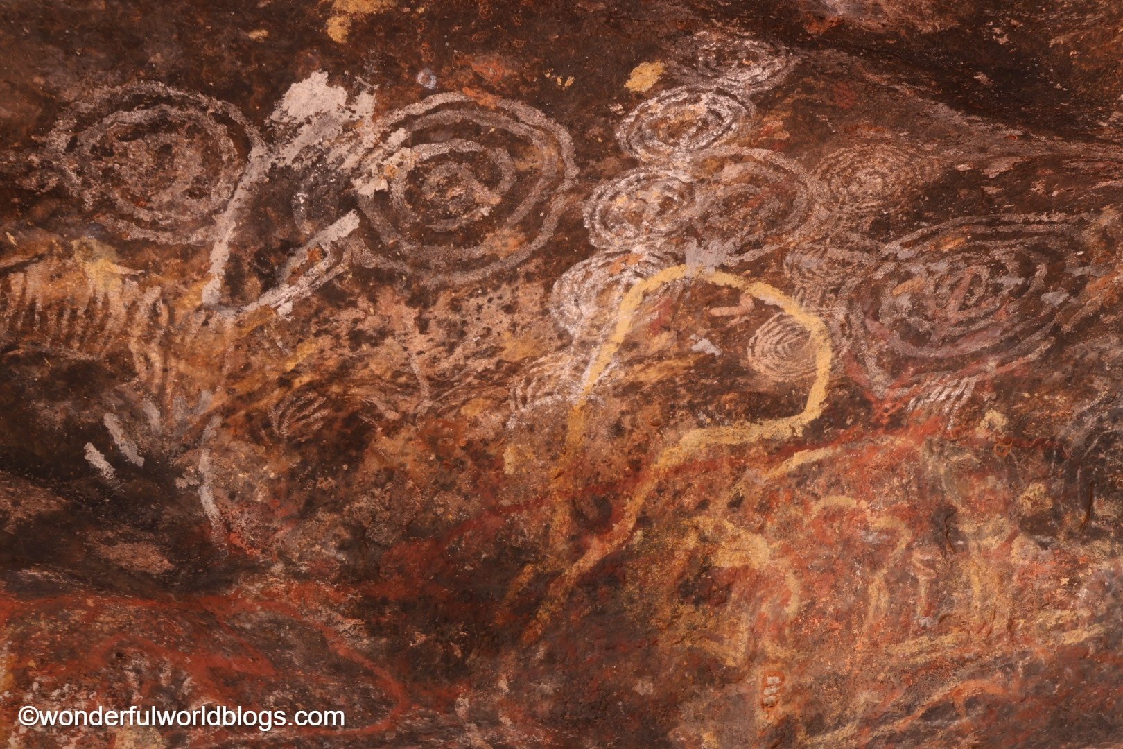 Its sheer size can only be taken in when you are there, its summit curving away out of sight, the near vertical walls towering above you, extending to either side as far as you can see. The rock is solid, uncrumbling, immortal, too steep and unyielding for vegetation. Here and there your eyes and mind follow precipitous gullys upwards, like they would the great pillars of a cathedral. At a heavenly and surprisingly deep natural spring, where trees gather to drink and birds to sing, Aboriginal people used to live, leaving mysterious, colourful, overlapping paintings on the walls of a nearby cave, looking more like modern than ancient art. The place has a huge, powerful, calm, wise, spiritual presence about it in the heat and silence of the desert. I placed my hand flat on the rock, almost expecting to feel its heart beat. After several hot dusty hours I managed to walk around most of its circumference, spying strange rock formations that your imagination turns into a giant mouth or a skull. Suddenly I heard a powerful force behind me and turned to see a mini whirlwind sucking up the dust as if the spirits of the place had awoken in anger. But the modern Aboriginal people were conspicuous by their absence.